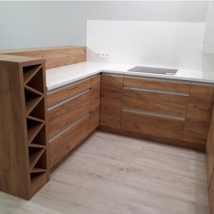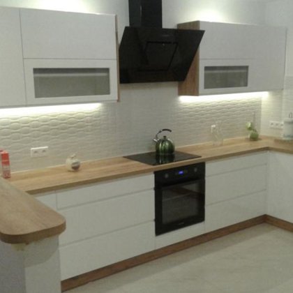 Kuchnia fronty MDF , szuflady białe oraz drewnopodobne wycisk tafla